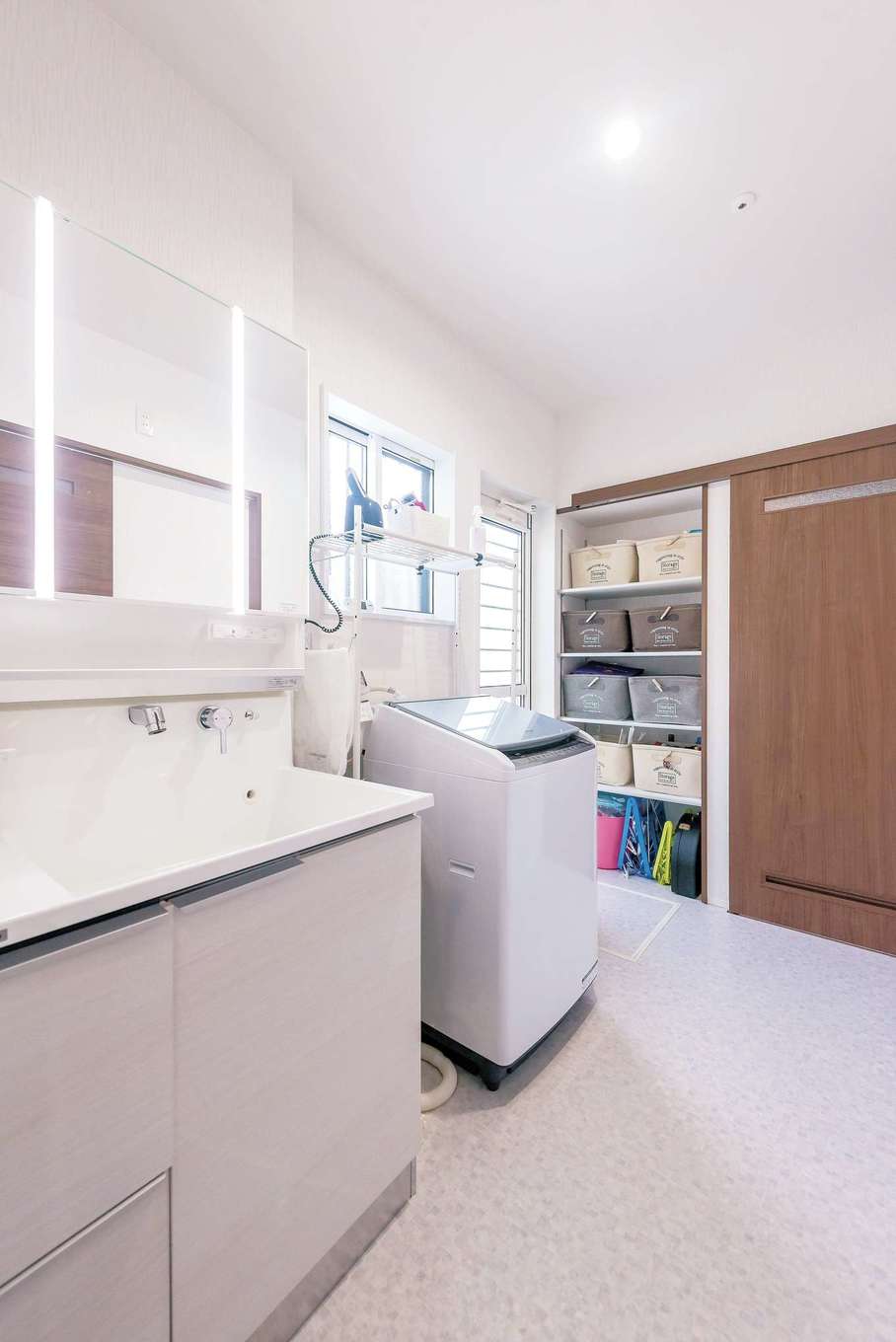 洗面脱衣所へは 階段下ホールとキッチンパントリーの2方向から出入りが可能 収納棚の隣の引き戸を開ければ キッチンパントリーにつながり 奥さま